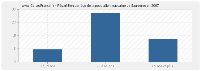 - Hommes de 20 à 64 ans habitant Saunières : 28