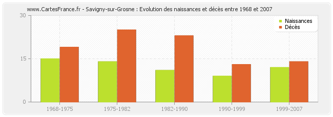Savigny-sur-Grosne : évolution des naissances et décès de 1968 à 2007