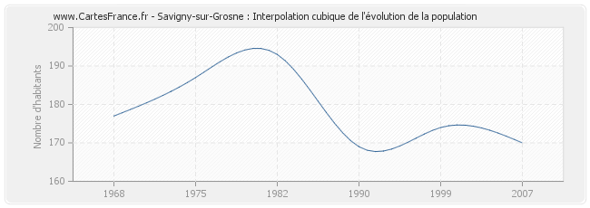 Cette courbe reprend l'historique de la population de Savigny-sur-Grosne de 1968 à 2007 en interpolation cubique. Ceci permet d'obtenir plus précisément la population de la commune de Savigny-sur-Grosne les années ou aucun recensement n'a été effectué.