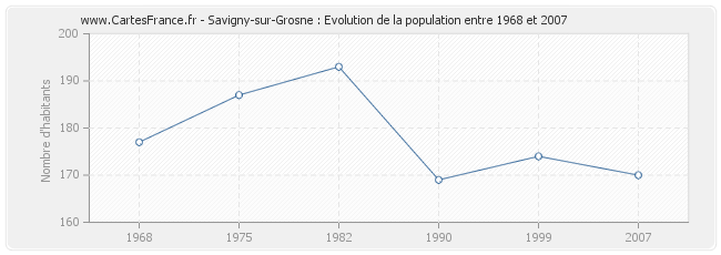 La population de Savigny-sur-Grosne était de 170 habitants en 2007, 174 habitants en 1999, 169 habitants en 1990, 193 habitants en 1982, 187 habitants en 1975 et 177 habitants en 1968.