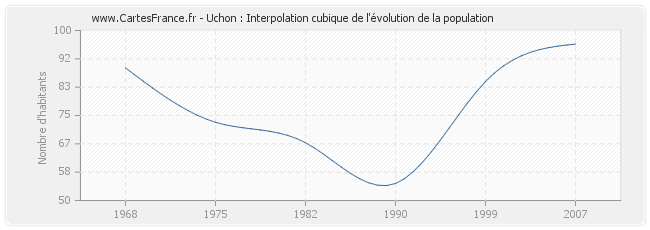 Cette courbe reprend l'historique de la population d'Uchon de 1968 à 2007 en interpolation cubique. Ceci permet d'obtenir plus précisément la population de la commune d'Uchon les années ou aucun recensement n'a été effectué.