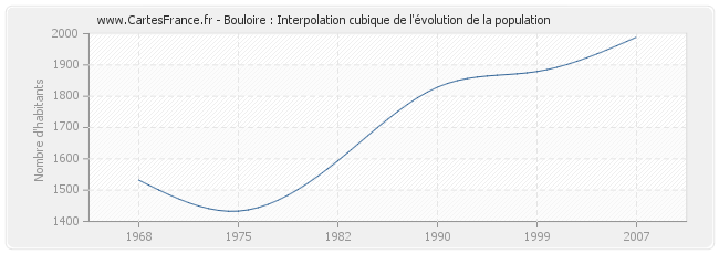 Cette courbe reprend l'historique de la population de Bouloire de 1968 à 2007 en interpolation cubique. Ceci permet d'obtenir plus précisément la population de la commune de Bouloire les années ou aucun recensement n'a été effectué.