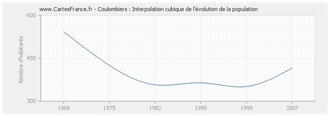 Cette courbe reprend l'historique de la population de Coulombiers de 1968 à 2007 en interpolation cubique. Ceci permet d'obtenir plus précisément la population de la commune de Coulombiers les années ou aucun recensement n'a été effectué.