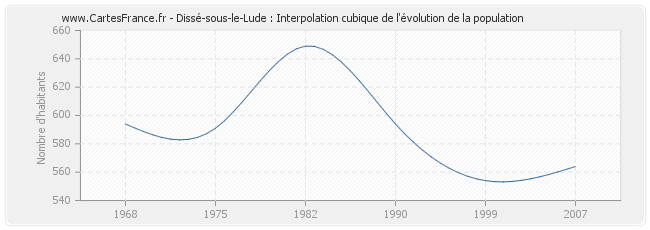 Cette courbe reprend l'historique de la population de Dissé-sous-le-Lude de 1968 à 2007 en interpolation cubique. Ceci permet d'obtenir plus précisément la population de la commune de Dissé-sous-le-Lude les années ou aucun recensement n'a été effectué.