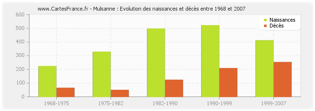 Mulsanne : évolution des naissances et décès de 1968 à 2007
