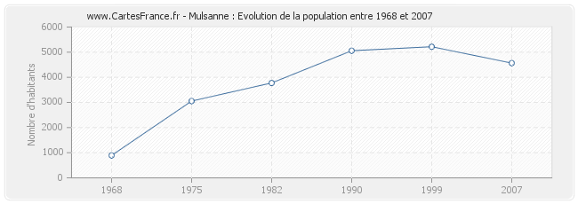 La population de Mulsanne était de 4 566 habitants en 2007, 5 217 habitants en 1999, 5 058 habitants en 1990, 3 776 habitants en 1982, 3 055 habitants en 1975 et 891 habitants en 1968.