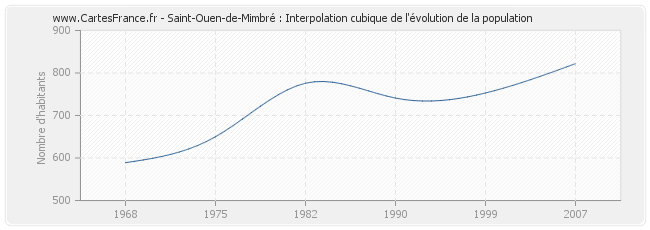 Cette courbe reprend l'historique de la population de Saint-Ouen-de-Mimbré de 1968 à 2007 en interpolation cubique. Ceci permet d'obtenir plus précisément la population de la commune de Saint-Ouen-de-Mimbré les années ou aucun recensement n'a été effectué.