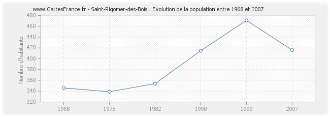 La population de Saint-Rigomer-des-Bois était de 416 habitants en 2007, 471 habitants en 1999, 415 habitants en 1990, 354 habitants en 1982, 339 habitants en 1975 et 346 habitants en 1968.