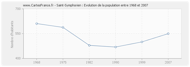 La population de Saint-Symphorien était de 550 habitants en 2007, 500 habitants en 1999, 469 habitants en 1990, 479 habitants en 1982, 588 habitants en 1975 et 611 habitants en 1968.