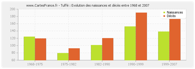 Tuffé : évolution des naissances et décès de 1968 à 2007