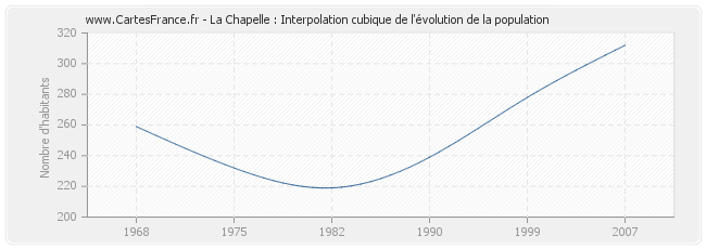 Cette courbe reprend l'historique de la population de La Chapelle de 1968 à 2007 en interpolation cubique. Ceci permet d'obtenir plus précisément la population de la commune de La Chapelle les années ou aucun recensement n'a été effectué.