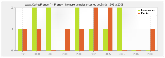 La population de Freney était de 117 habitants en 2007, 85 habitants en 1999, 124 habitants en 1990, 151 habitants en 1982, 187 habitants en 1975 et 323 habitants en 1968.
