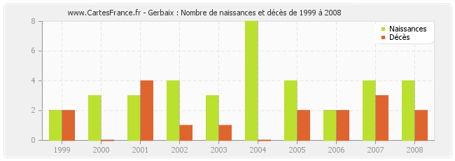 - Gerbaix en 2008 : 4 naissances et 2 décès