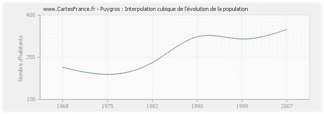 Cette courbe reprend l'historique de la population de Puygros de 1968 à 2007 en interpolation cubique. Ceci permet d'obtenir plus précisément la population de la commune de Puygros les années ou aucun recensement n'a été effectué.