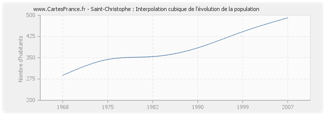 Cette courbe reprend l'historique de la population de Saint-Christophe de 1968 à 2007 en interpolation cubique. Ceci permet d'obtenir plus précisément la population de la commune de Saint-Christophe les années ou aucun recensement n'a été effectué.