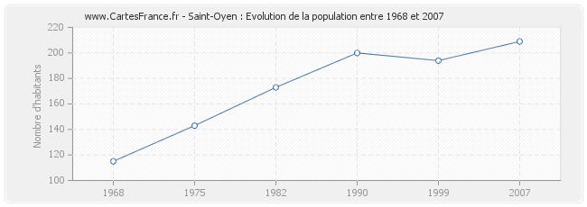Cette courbe reprend l'historique de la population de Saint-Oyen de 1968 à 2007 en interpolation cubique. Ceci permet d'obtenir plus précisément la population de la commune de Saint-Oyen les années ou aucun recensement n'a été effectué.
