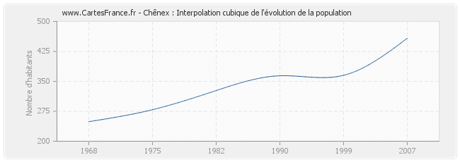 Cette courbe reprend l'historique de la population de Chênex de 1968 à 2007 en interpolation cubique. Ceci permet d'obtenir plus précisément la population de la commune de Chênex les années ou aucun recensement n'a été effectué.