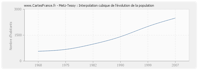 Cette courbe reprend l'historique de la population de Metz-Tessy de 1968 à 2007 en interpolation cubique. Ceci permet d'obtenir plus précisément la population de la commune de Metz-Tessy les années ou aucun recensement n'a été effectué.
