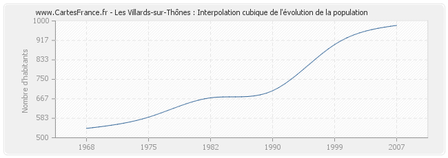 Cette courbe reprend l'historique de la population de Les Villards-sur-Thônes de 1968 à 2007 en interpolation cubique. Ceci permet d'obtenir plus précisément la population de la commune de Les Villards-sur-Thônes les années ou aucun recensement n'a été effectué.
