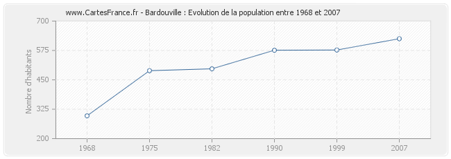 La population de Bardouville était de 625 habitants en 2007, 577 habitants en 1999, 576 habitants en 1990, 497 habitants en 1982, 489 habitants en 1975 et 297 habitants en 1968.