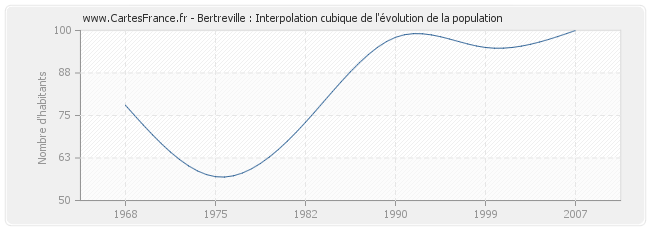 Cette courbe reprend l'historique de la population de Bertreville de 1968 à 2007 en interpolation cubique. Ceci permet d'obtenir plus précisément la population de la commune de Bertreville les années ou aucun recensement n'a été effectué.