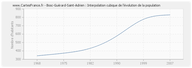 Cette courbe reprend l'historique de la population de Bosc-Guérard-Saint-Adrien de 1968 à 2007 en interpolation cubique. Ceci permet d'obtenir plus précisément la population de la commune de Bosc-Guérard-Saint-Adrien les années ou aucun recensement n'a été effectué.