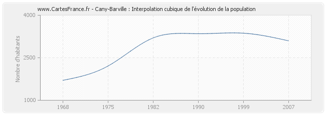 Cette courbe reprend l'historique de la population de Cany-Barville de 1968 à 2007 en interpolation cubique. Ceci permet d'obtenir plus précisément la population de la commune de Cany-Barville les années ou aucun recensement n'a été effectué.