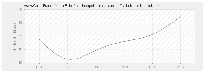 Cette courbe reprend l'historique de la population de La Folletière de 1968 à 2007 en interpolation cubique. Ceci permet d'obtenir plus précisément la population de la commune de La Folletière les années ou aucun recensement n'a été effectué.