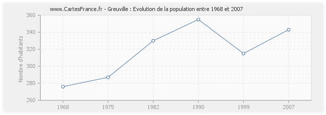 La population de Greuville était de 343 habitants en 2007, 315 habitants en 1999, 355 habitants en 1990, 330 habitants en 1982, 287 habitants en 1975 et 276 habitants en 1968.