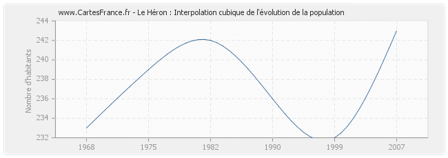 Cette courbe reprend l'historique de la population de Le Héron de 1968 à 2007 en interpolation cubique. Ceci permet d'obtenir plus précisément la population de la commune de Le Héron les années ou aucun recensement n'a été effectué.