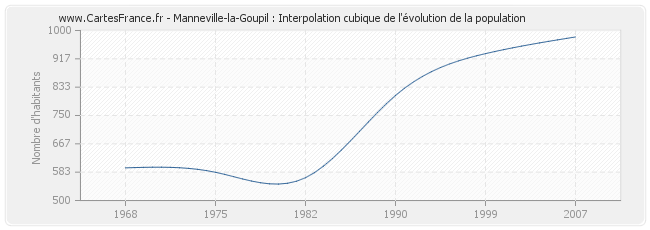 Cette courbe reprend l'historique de la population de Manneville-la-Goupil de 1968 à 2007 en interpolation cubique. Ceci permet d'obtenir plus précisément la population de la commune de Manneville-la-Goupil les années ou aucun recensement n'a été effectué.