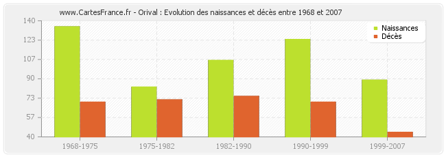La population d'Orival était de 955 habitants en 2007, 1 071 habitants en 1999, 1 004 habitants en 1990, 926 habitants en 1982, 1 132 habitants en 1975 et 1 164 habitants en 1968.