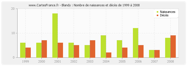 La population de Blandy était de 753 habitants en 2007, 721 habitants en 1999, 667 habitants en 1990, 609 habitants en 1982, 561 habitants en 1975 et 620 habitants en 1968.