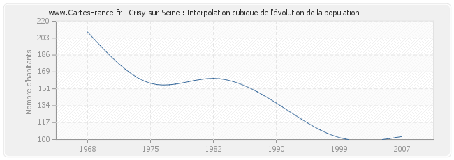 Cette courbe reprend l'historique de la population de Grisy-sur-Seine de 1968 à 2007 en interpolation cubique. Ceci permet d'obtenir plus précisément la population de la commune de Grisy-sur-Seine les années ou aucun recensement n'a été effectué.
