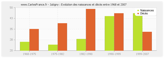 Jutigny : évolution des naissances et décès de 1968 à 2007
