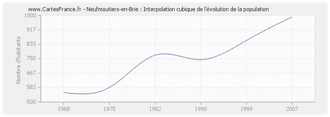 Cette courbe reprend l'historique de la population de Neufmoutiers-en-Brie de 1968 à 2007 en interpolation cubique. Ceci permet d'obtenir plus précisément la population de la commune de Neufmoutiers-en-Brie les années ou aucun recensement n'a été effectué.