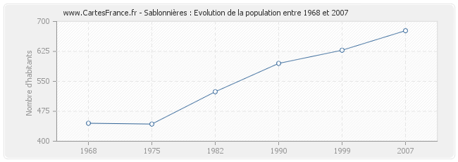 La population de Sablonnières était de 677 habitants en 2007, 628 habitants en 1999, 595 habitants en 1990, 524 habitants en 1982, 443 habitants en 1975 et 445 habitants en 1968.