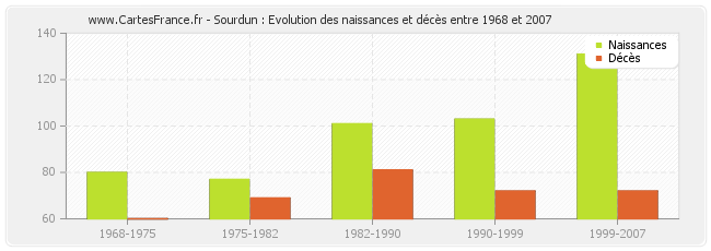 Sourdun : évolution des naissances et décès de 1968 à 2007