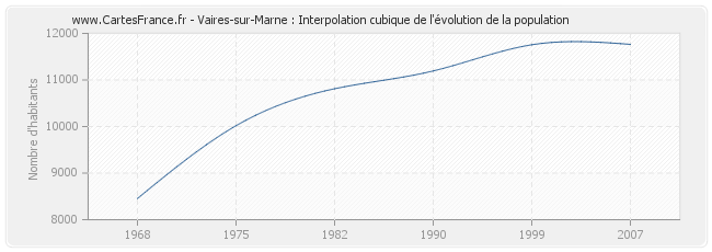 Cette courbe reprend l'historique de la population de Vaires-sur-Marne de 1968 à 2007 en interpolation cubique. Ceci permet d'obtenir plus précisément la population de la commune de Vaires-sur-Marne les années ou aucun recensement n'a été effectué.