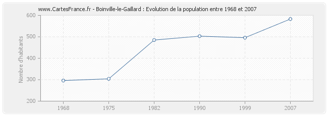 La population de Boinville-le-Gaillard était de 583 habitants en 2007, 496 habitants en 1999, 503 habitants en 1990, 485 habitants en 1982, 304 habitants en 1975 et 296 habitants en 1968.