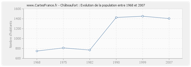 La population de Châteaufort était de 1 405 habitants en 2007, 1 452 habitants en 1999, 1 427 habitants en 1990, 769 habitants en 1982, 812 habitants en 1975 et 749 habitants en 1968.