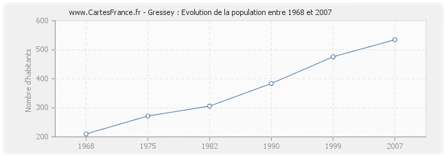 La population de Gressey était de 535 habitants en 2007, 476 habitants en 1999, 384 habitants en 1990, 306 habitants en 1982, 272 habitants en 1975 et 210 habitants en 1968.