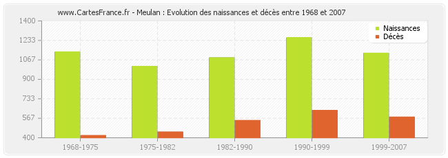 Meulan : évolution des naissances et décès de 1968 à 2007