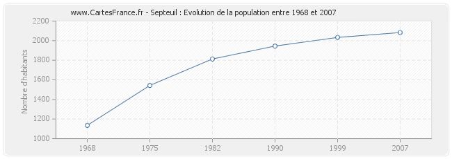 La population de Septeuil était de 2 083 habitants en 2007, 2 033 habitants en 1999, 1 945 habitants en 1990, 1 813 habitants en 1982, 1 543 habitants en 1975 et 1 135 habitants en 1968.