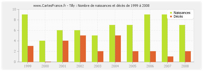 Tilly : évolution des naissances et décès de 1968 à 2007