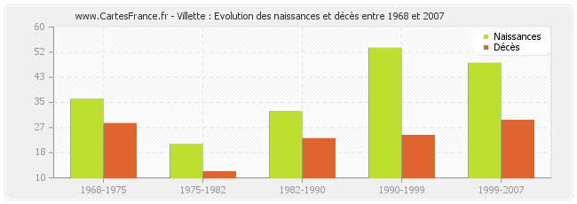 La population de Villette était de 518 habitants en 2007, 470 habitants en 1999, 439 habitants en 1990, 300 habitants en 1982, 295 habitants en 1975 et 234 habitants en 1968.