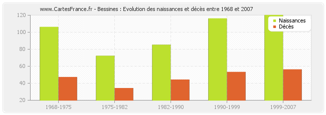 Bessines : évolution des naissances et décès de 1968 à 2007