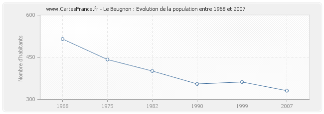 La population de Le Beugnon était de 331 habitants en 2007, 362 habitants en 1999, 355 habitants en 1990, 401 habitants en 1982, 442 habitants en 1975 et 515 habitants en 1968.