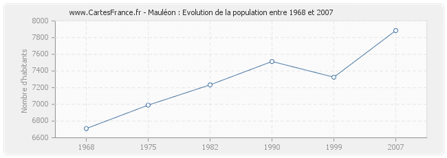 Cette courbe reprend l'historique de la population de Mauléon de 1968 à 2007 en interpolation cubique. Ceci permet d'obtenir plus précisément la population de la commune de Mauléon les années ou aucun recensement n'a été effectué.