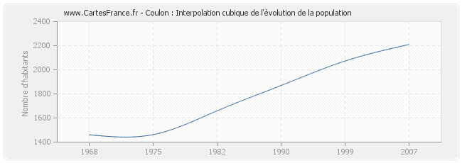 Cette courbe reprend l'historique de la population de Coulon de 1968 à 2007 en interpolation cubique. Ceci permet d'obtenir plus précisément la population de la commune de Coulon les années ou aucun recensement n'a été effectué.